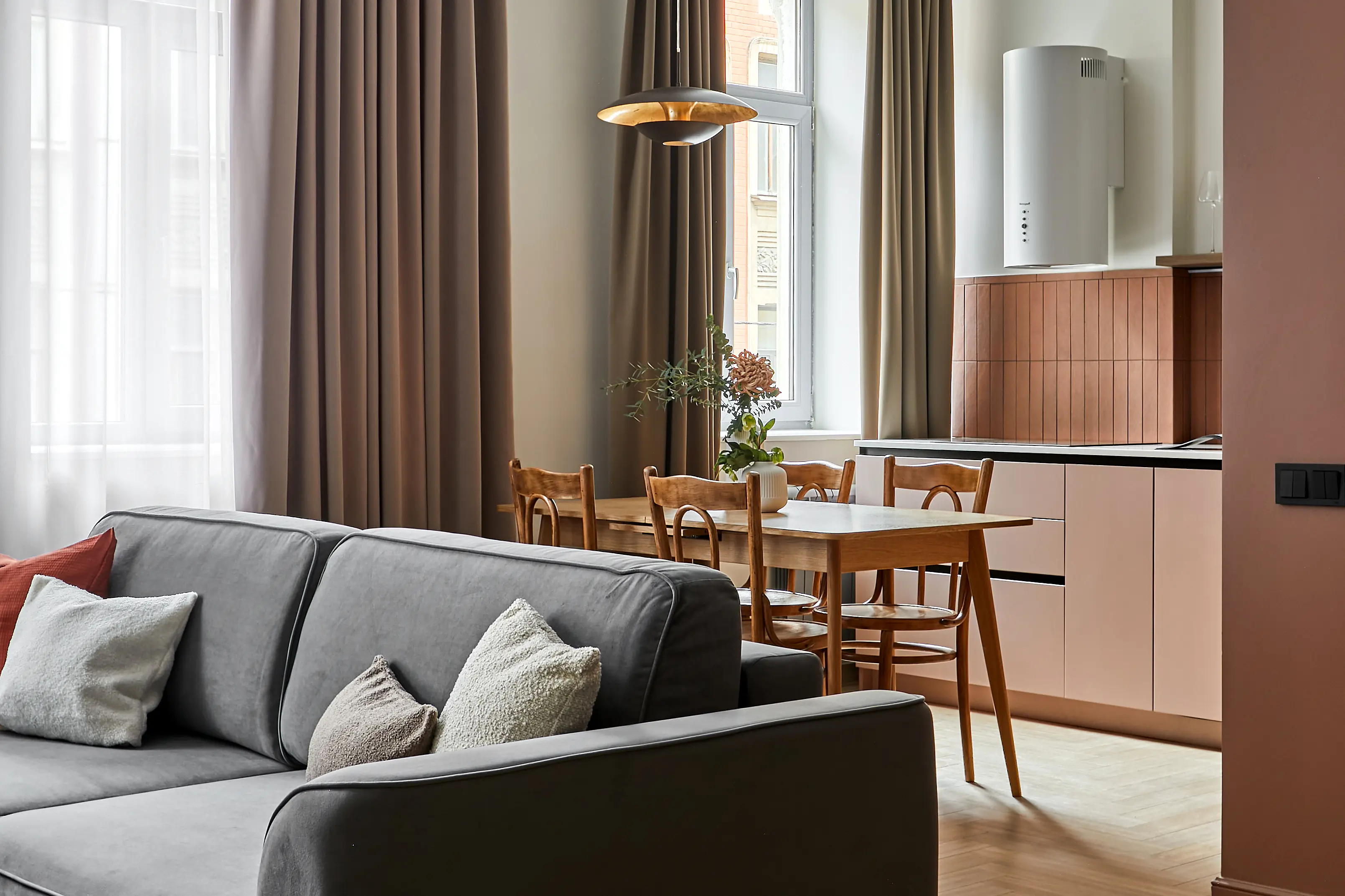 גוון הטרקוטה העז נבחר בהשראת "בית דראשב" ההיסטורי הסמוך, המחופה לבנים אדומות. הצבע שולב בעיצוב המטבח והסלון ויוצר דיאלוג חזותי עם הסביבה העירונית.