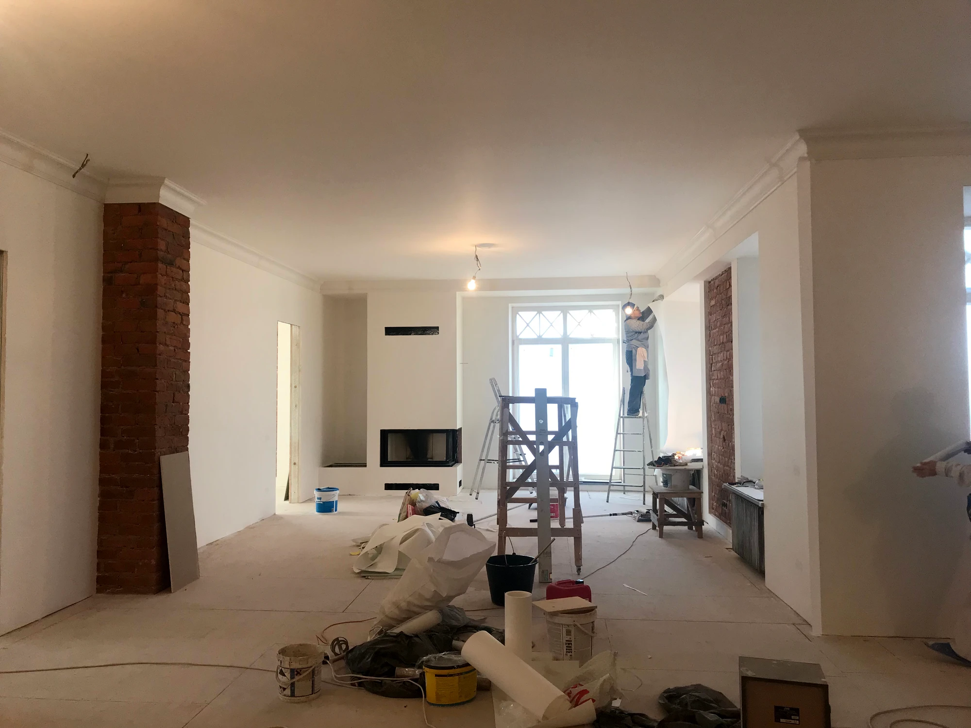 תכנון החלל המרכזי כלל קמין עצים, מה שחייב בדיקה יסודית של הארובה המקורית. התגלה כי מצב הלבנים בקיר דרש שיקום פנימי (Lining) לכל אורך הארובה. המשימה הייתה מורכבת במיוחד מבחינה הנדסית בשל הקרבה לפתחים החדשים שנפרצו באותו הקיר.